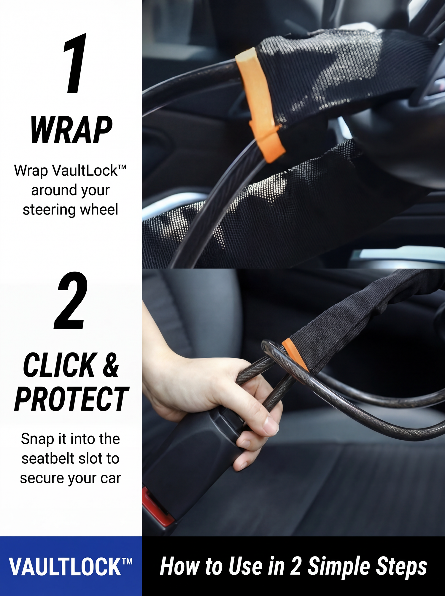 Hook VaultLock™ around your steering wheel, lock it with the included keys, and walk away knowing your car is protected. No tools needed. No complicated installation. No chance for thieves. It's the easiest security upgrade you'll ever make and the most effective.